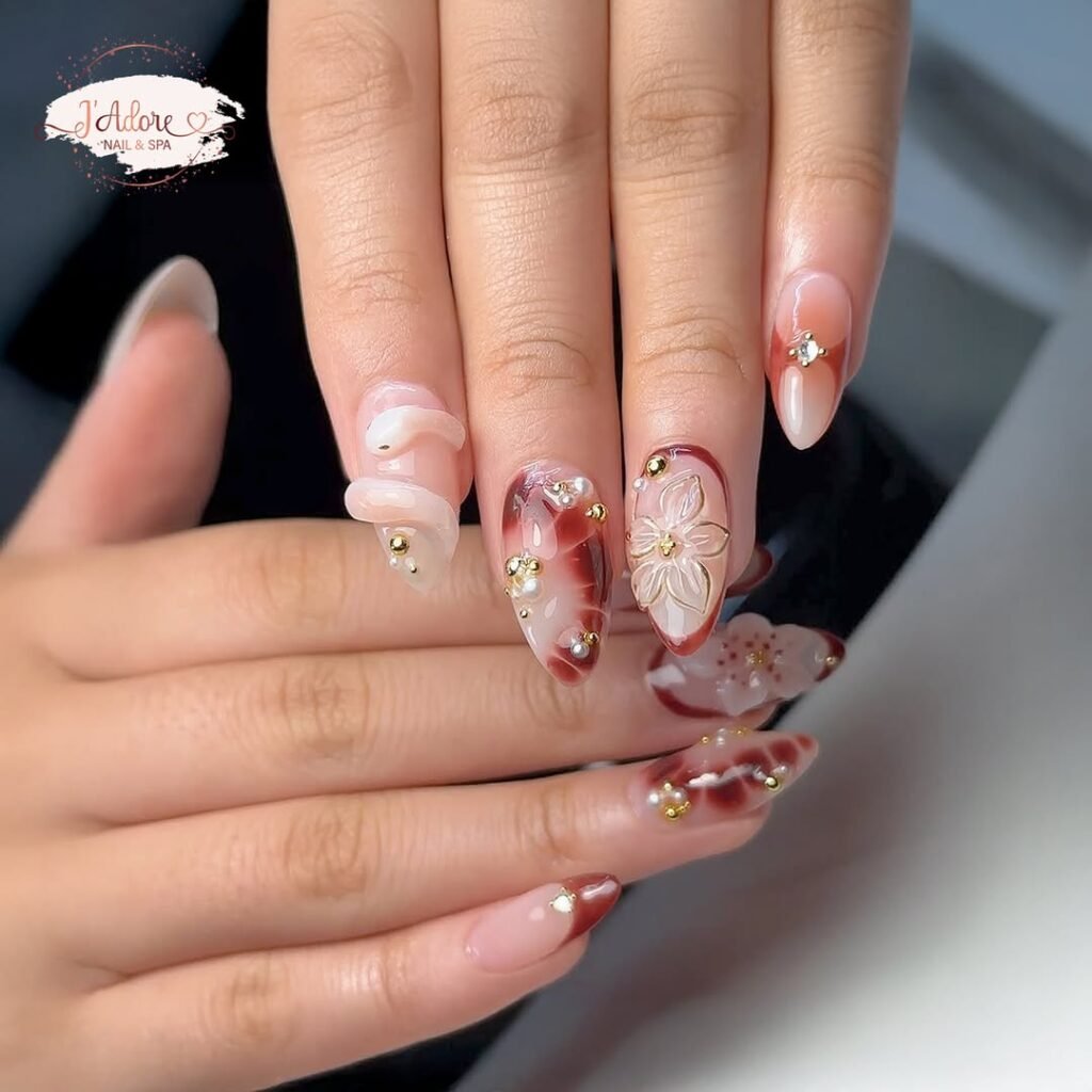 Each nail in this set is its own little masterpiece—think sculpted petals, soft blush tones, golden studs, and high-gloss finishes. It’s luxe, intricate, and unapologetically feminine.