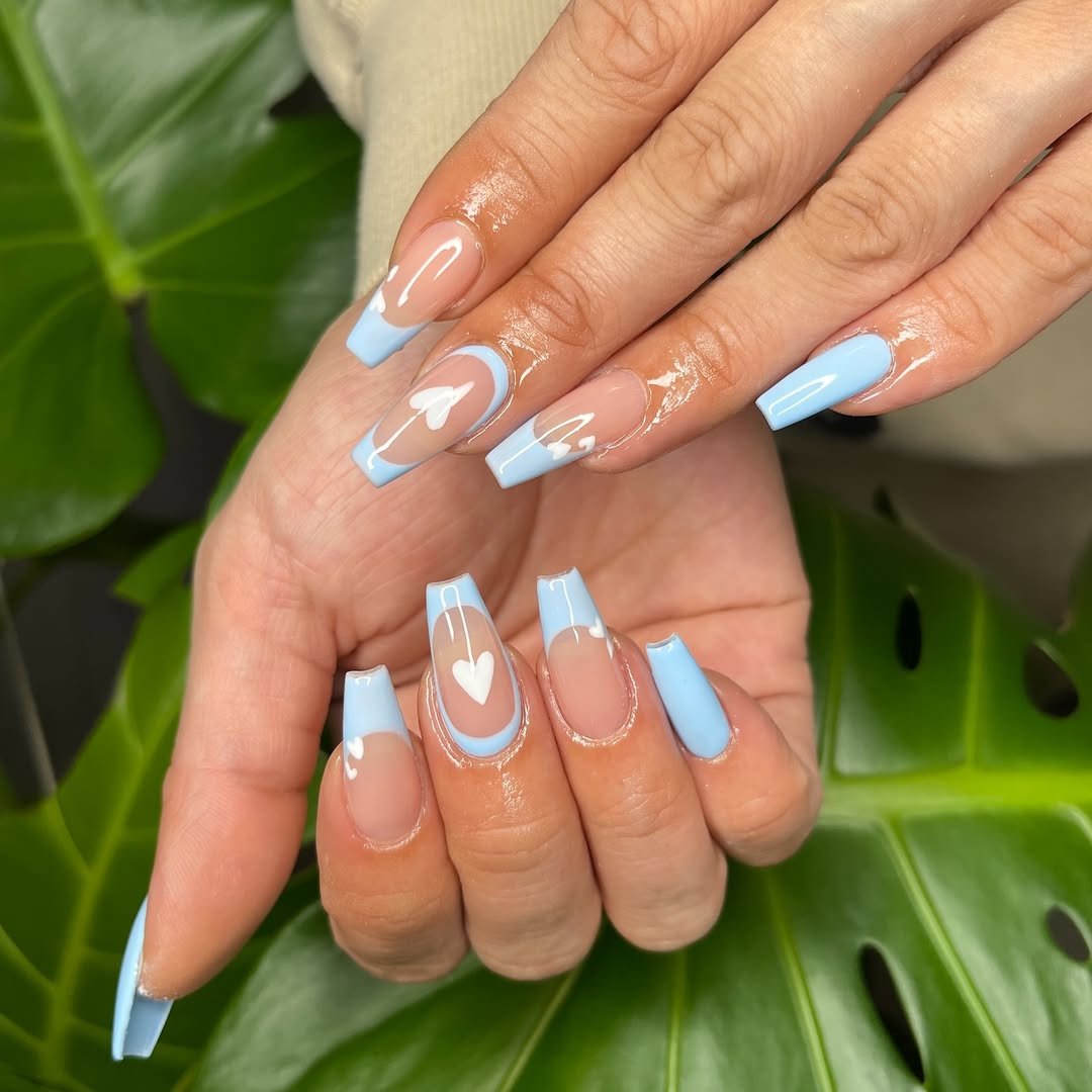 Pale blue French tips meet delicate white heart details for a mani that feels as sweet as a love letter. Glossy finishes and soft curves give it that perfect dreamy softness.