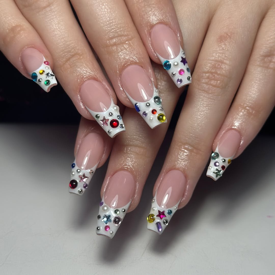 Imagine a French tip that walked into a jewelry store and said, “I want it all.” With candy-colored rhinestones, pearl accents, and star studs twinkling over crisp white tips, the look is pure party-on-my-hands.