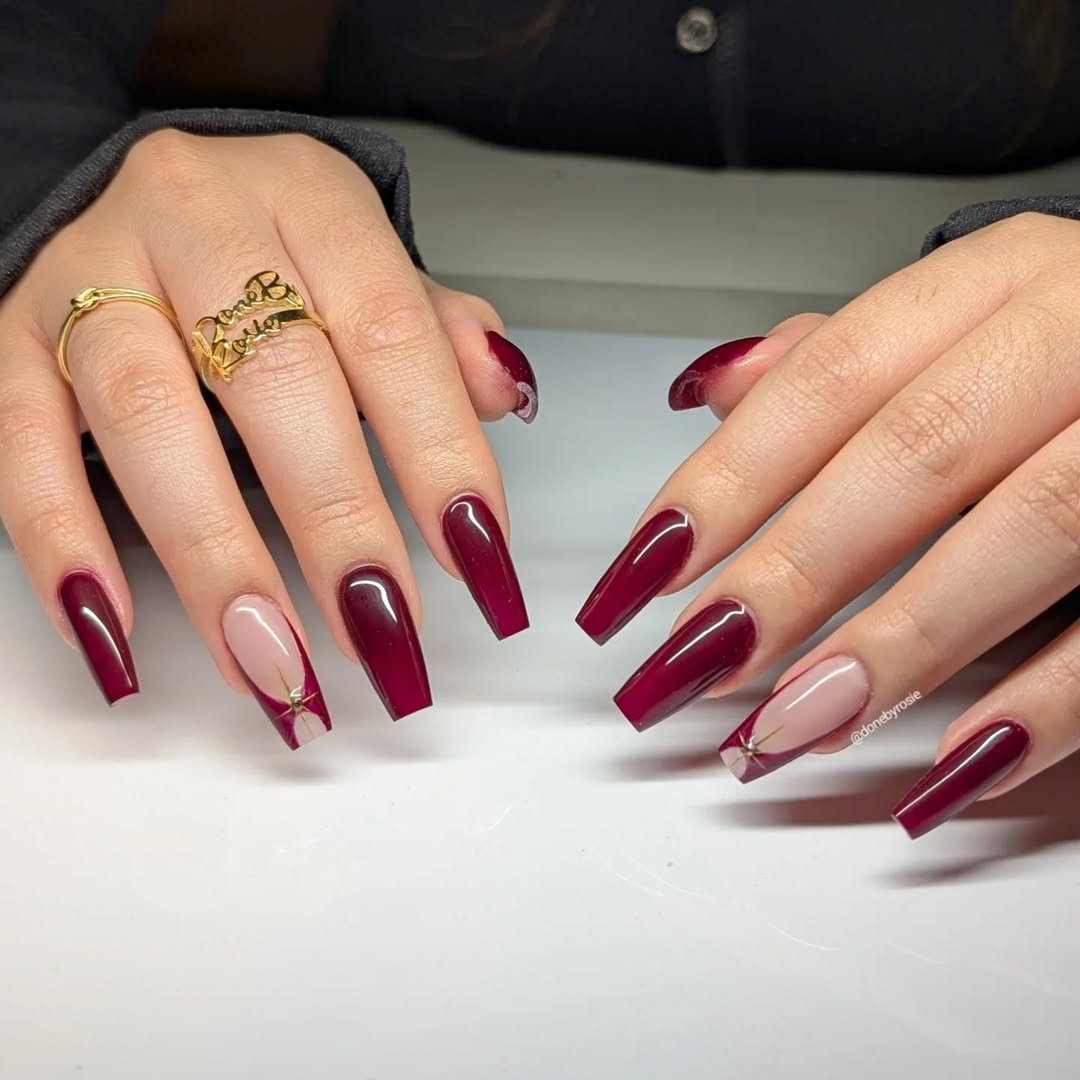 Slick burgundy polish takes center stage, but it’s the sharp V-cut accents and blush-toned base that add modern sophistication. Gold foil bows on two nails seal the whole luxe vibe.