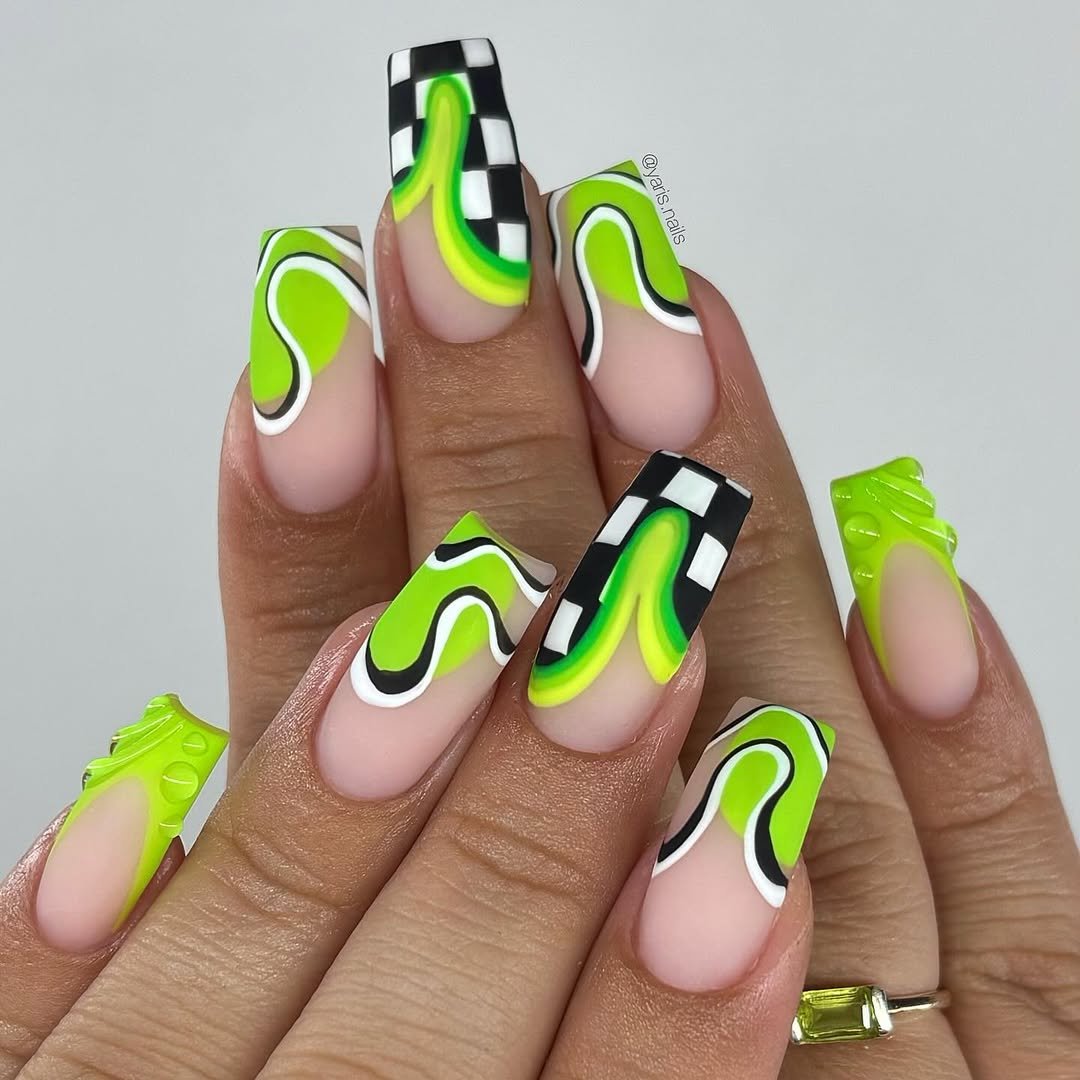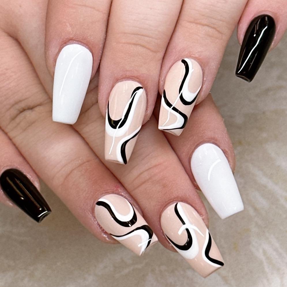 Black and white blocks collide with curvy abstract swirls across nude bases, creating a super-bold statement that feels equal parts artsy and editorial.