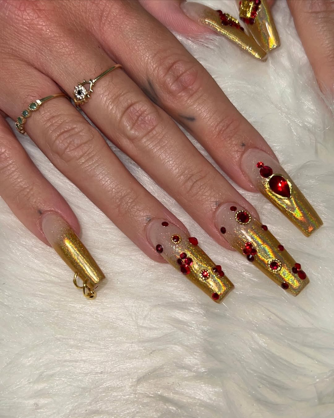 Dripping in molten gold with ruby-red crystals blazing down the center, this set doesn’t just sparkle—it radiates. The holographic chrome dances under the light like treasure pulled from a dragon’s cave, and the dangling charm? Pure attitude.