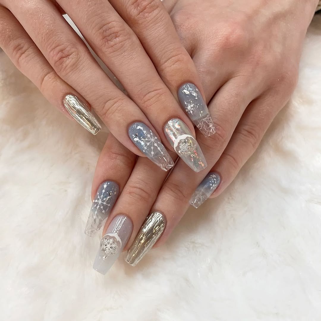 Frozen blues, chrome foils, and layered snowflake details combine to create something that feels fresh out of a winter fairytale. The effect is delicate, but powerful.