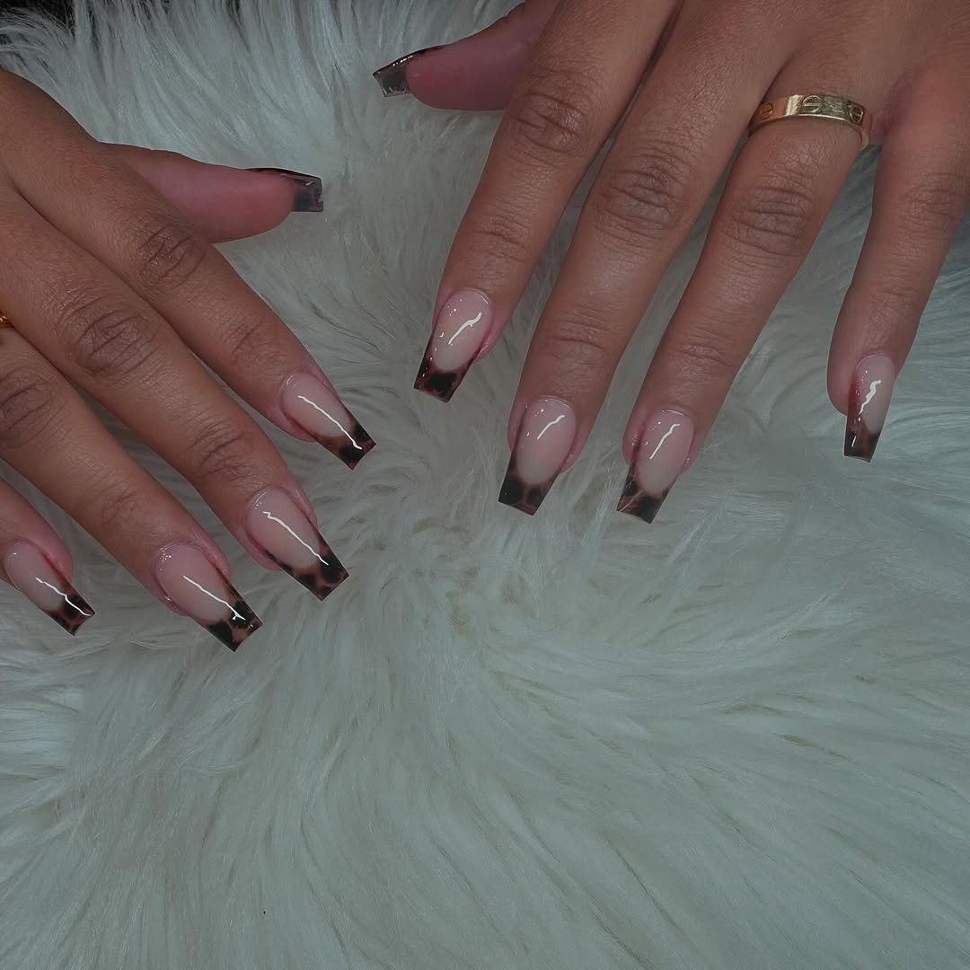 Moody, marbled tortoiseshell tips bring a richness that feels like autumn in Paris. Set against sleek nude bases and shaped to perfection, they look like vintage sunglasses turned into luxury nail art.