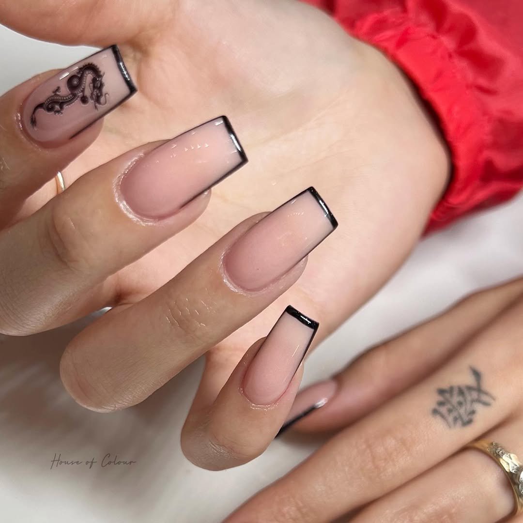 No-nonsense lines and jet-black tips take a clean nude base and flip it into something striking. And let’s not ignore that lone dragon decal—it’s giving quiet rebellion with polished intent.