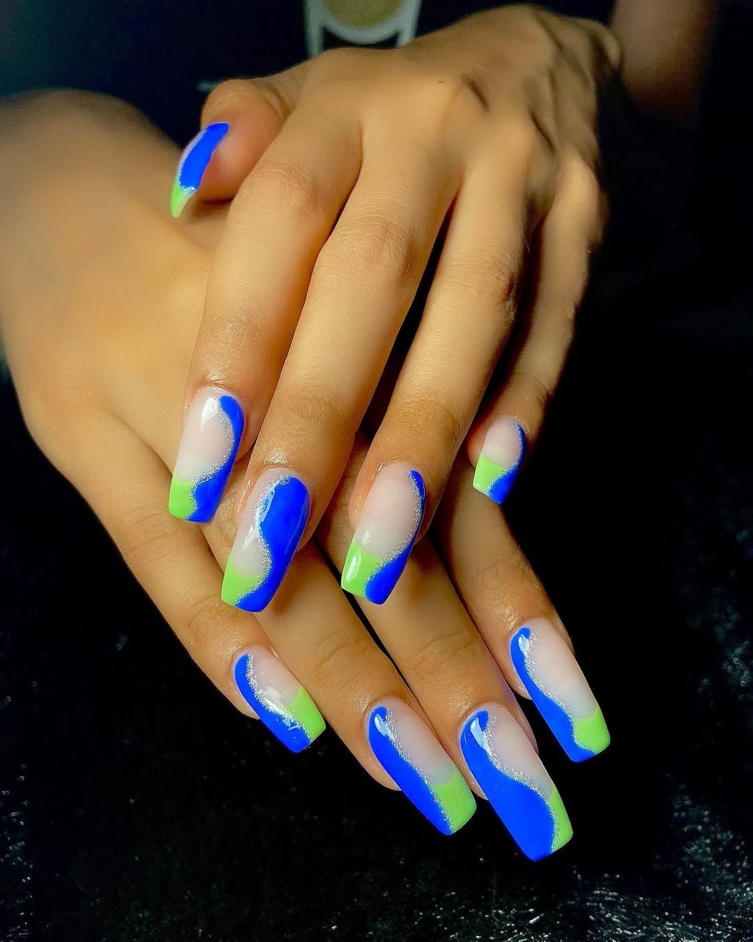 Blue and green waves crash across each nail like an electric ocean, pulsing with color that looks alive under the light. The lines are bold, the shape is flawless, and the vibe is pure adrenaline.