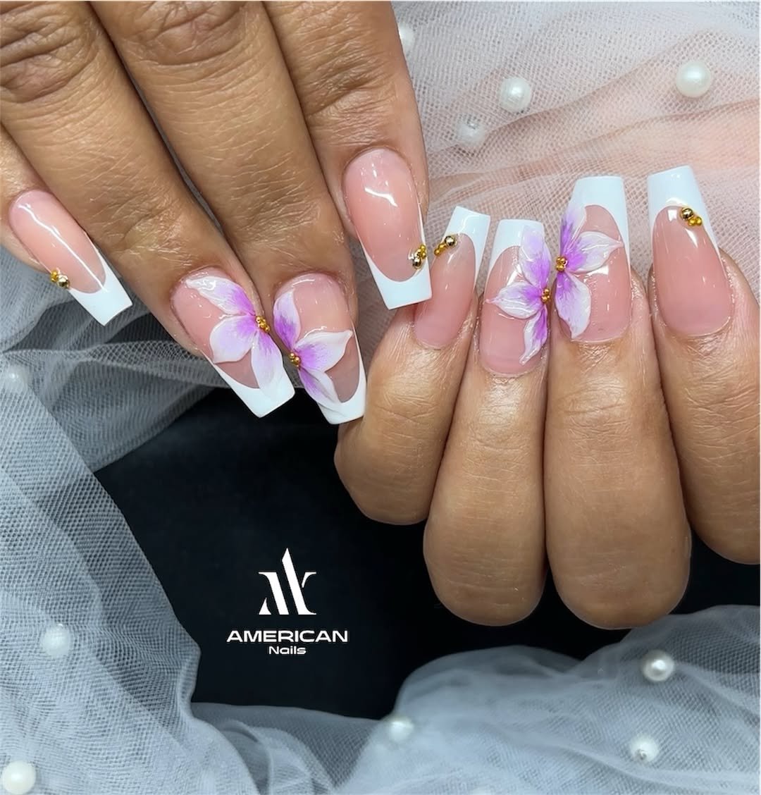Soft orchid petals bloom across sculpted white tips, blending dreamy watercolor tones with glossy precision. Golden studs dot the center of each flower, adding just the right touch of elegance.