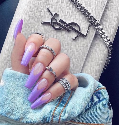 Vibrant lavender acrylics steal the spotlight with V-cut angles, hyper-gloss shine, and that perfect almond shape. Stack some silver rings on top and suddenly you’re holding a whole aesthetic in your hands.