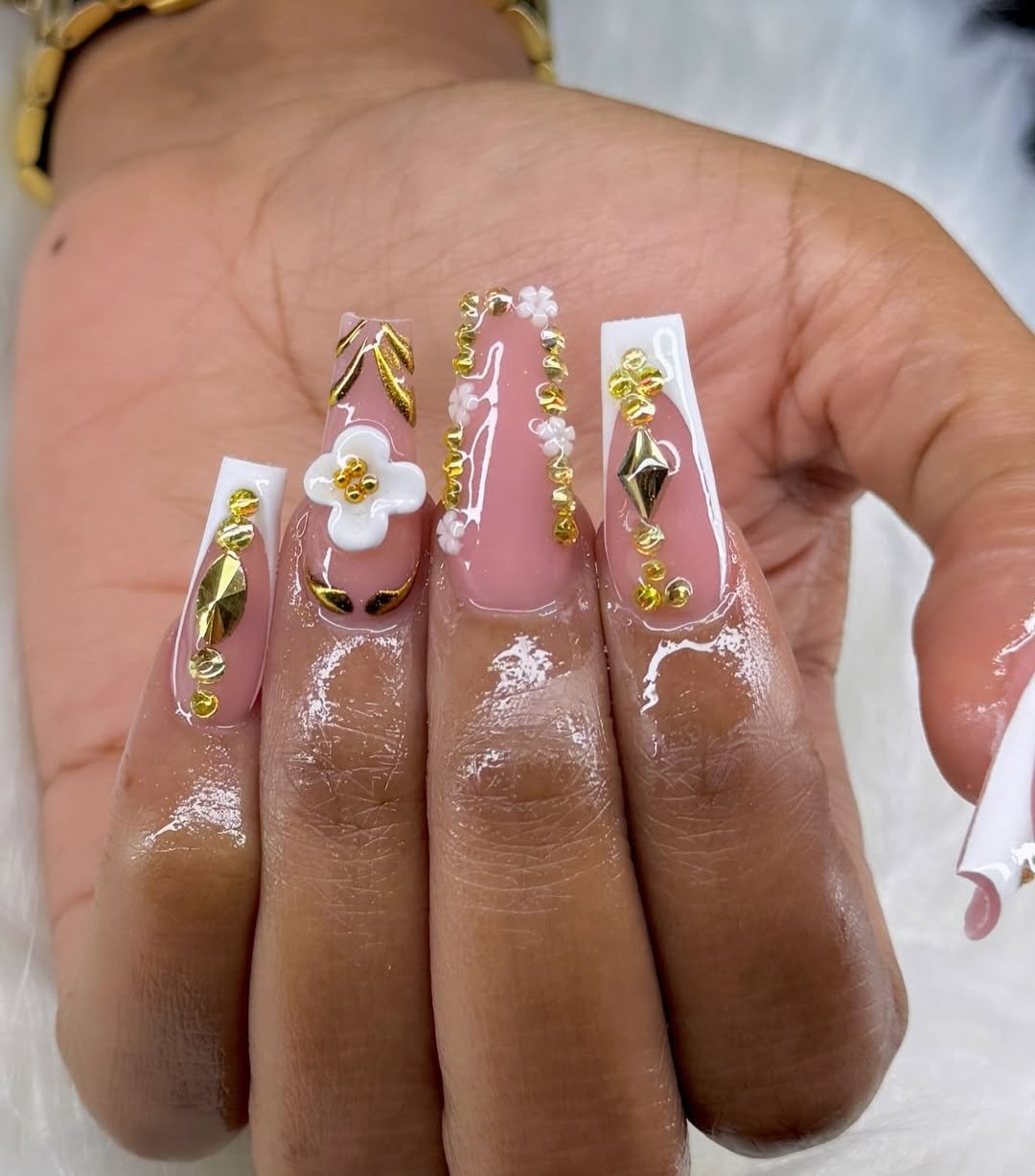Baroque gold elements twirl around 3D white florals like royalty stamped onto glass. Every nail is a masterpiece layered with beads, shine, and ornate detail that looks handcrafted by a jewelry artist.