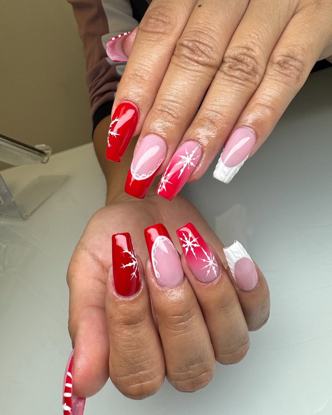Red polish gets playful with pink and white accents that feel like peppermint hot chocolate and Christmas lights wrapped into one. Add in hand-drawn snowflakes and 3D whipped textures and it’s full-blown holiday magic.