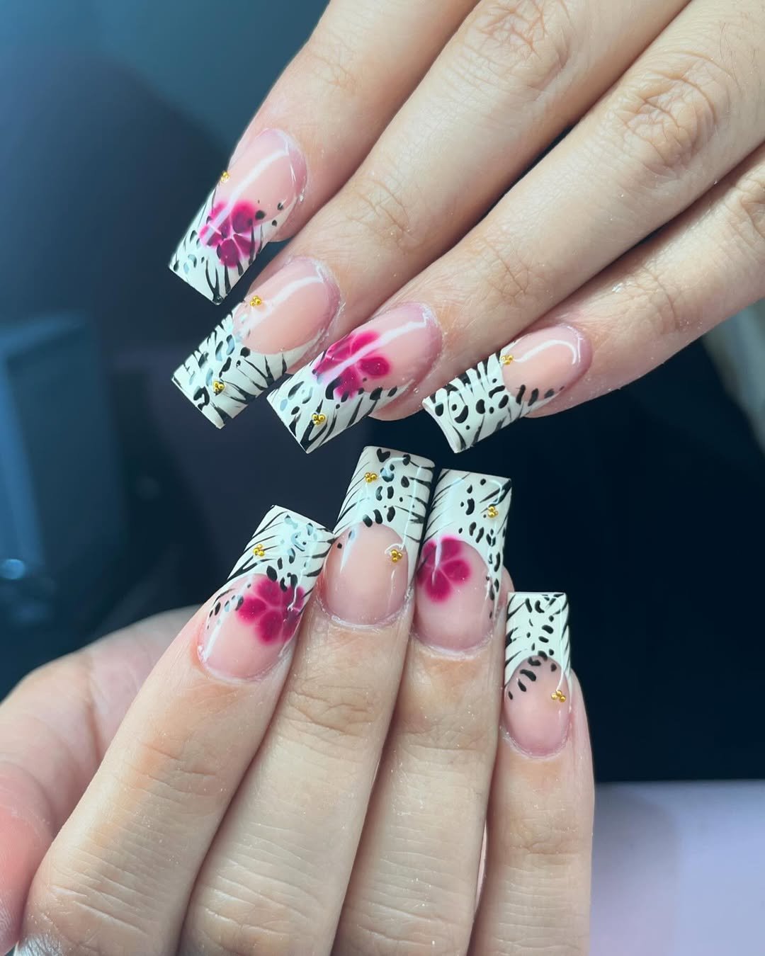 Tropical magenta florals burst across jungle print tips with the kind of energy that screams island goddess. A few tiny gold studs bring in just enough bling to say you know how to party and pose.