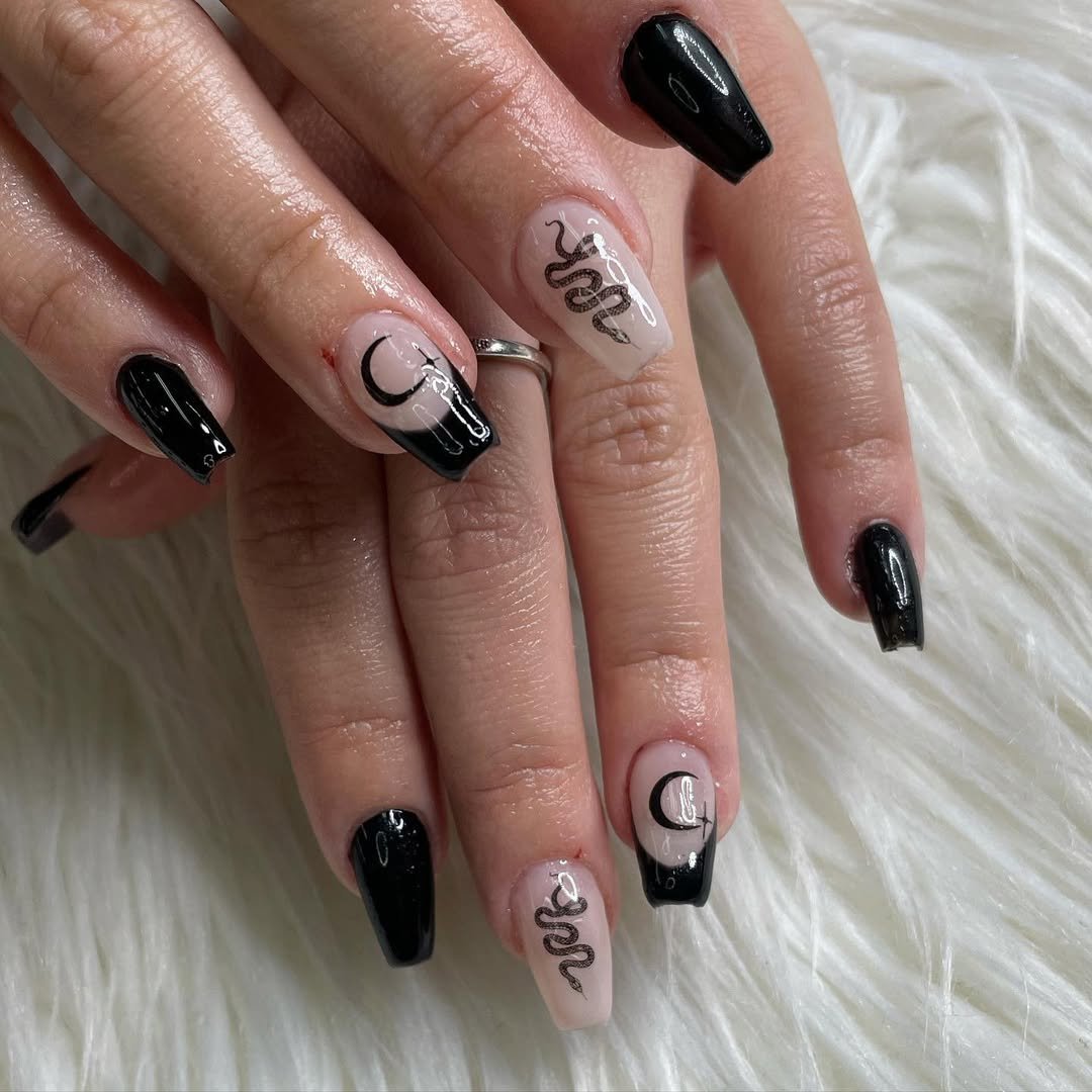 Moody contrasts and bold black polish bring out an edgy aesthetic, but the magic lies in the symbols—snakes, moons, and slivers of mystery etched into each nail.