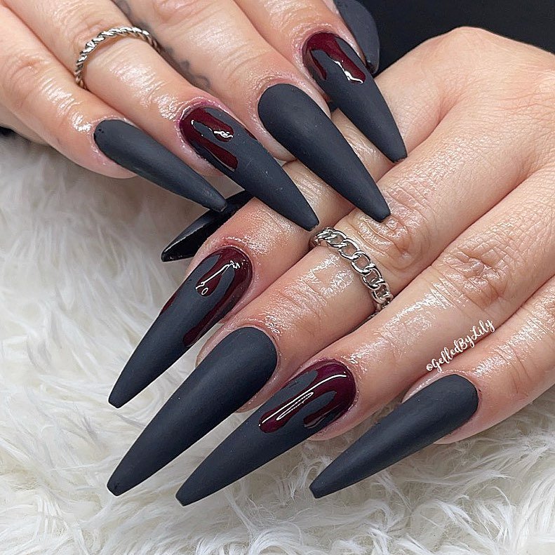 Sharp, stiletto-point perfection drenched in mystery—these matte black nails are sliced open by glossy crimson drips, like molten lava spilling from the shadows. It’s theatrical, intoxicating, and unapologetically bold.