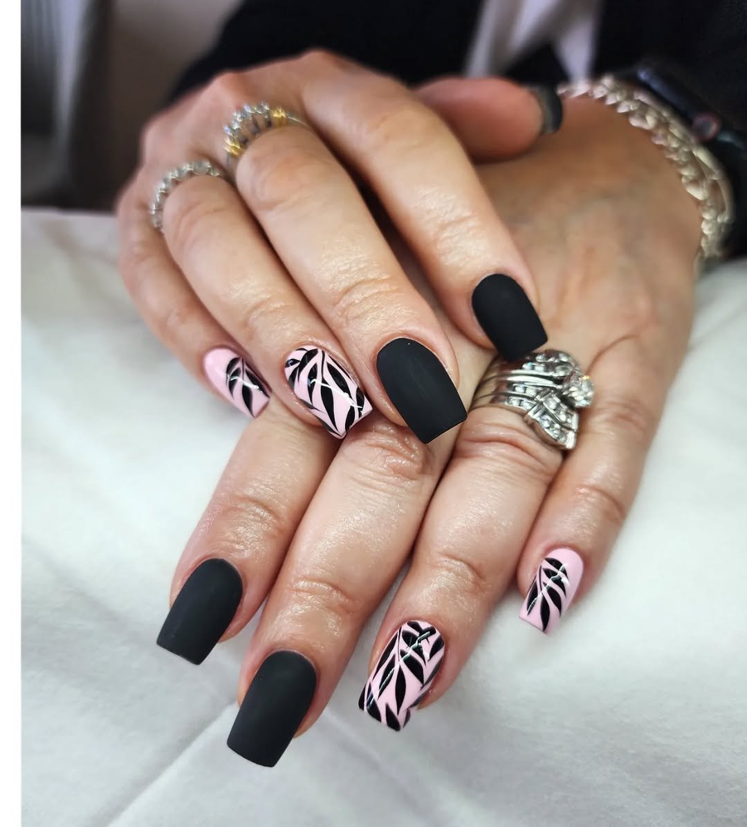 Soft pink blooms with black botanical silhouettes, flanked by jet matte black nails like bodyguards for a queen. Every curve of the leaves mirrors the almond shape perfectly, making it feel intentional, intimate, expensive.