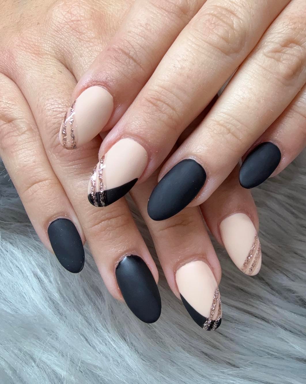 A perfect collision of soft matte nude, inky black, and precise lines of rose-gold glitter. The design flows diagonally, creating movement and elongating the nails while keeping the palette sophisticated.