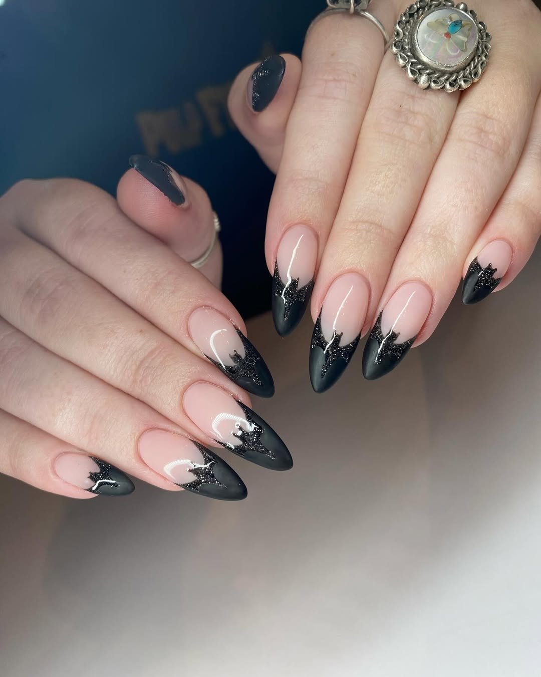 Imagine a twilight sky fading into midnight, but with every star and shimmer condensed at your fingertips. These almond tips start in a soft, translucent nude, melting into matte black, and dusted with fine black glitter that twinkles with movement.