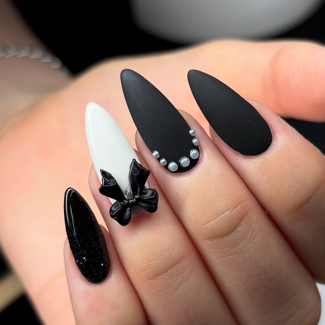Black and white are no longer opposites—they’re conspirators. Matte black stiletto tips, pearl-lined crescents, and a sculpted 3D bow that looks like it belongs on a Givenchy gown… this isn’t just a manicure, it’s couture in miniature. The textures—velvet matte, glassy gloss, creamy white—dance together like models turning under runway spotlights.