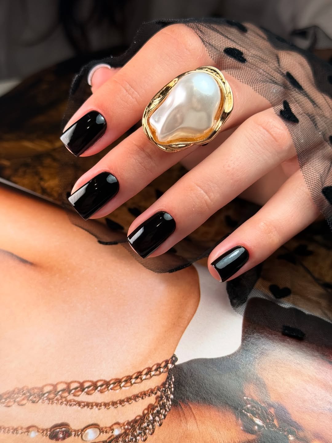 Short and squared, yet dripping in sophistication, this glossy jet-black finish is proof you don’t need length to command attention. The shine is so rich, it feels like liquid glass, perfectly offset by clean, sculpted edges.