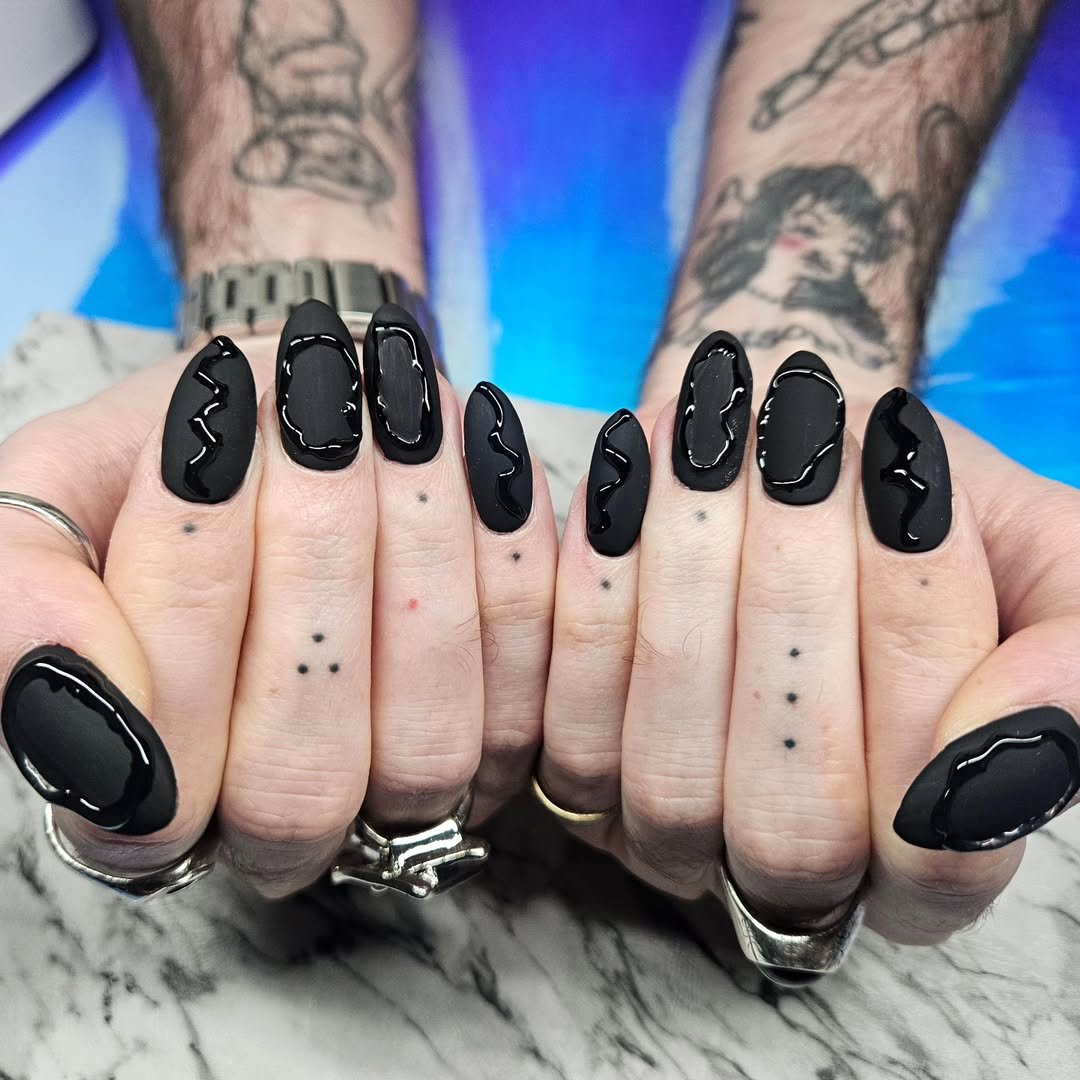 Velvety matte black meets high-shine gloss in a design that looks like liquid ink has been poured across each nail. The shapes ripple and flow unpredictably, like molten metal hardening mid-drip, giving every fingertip its own art installation.