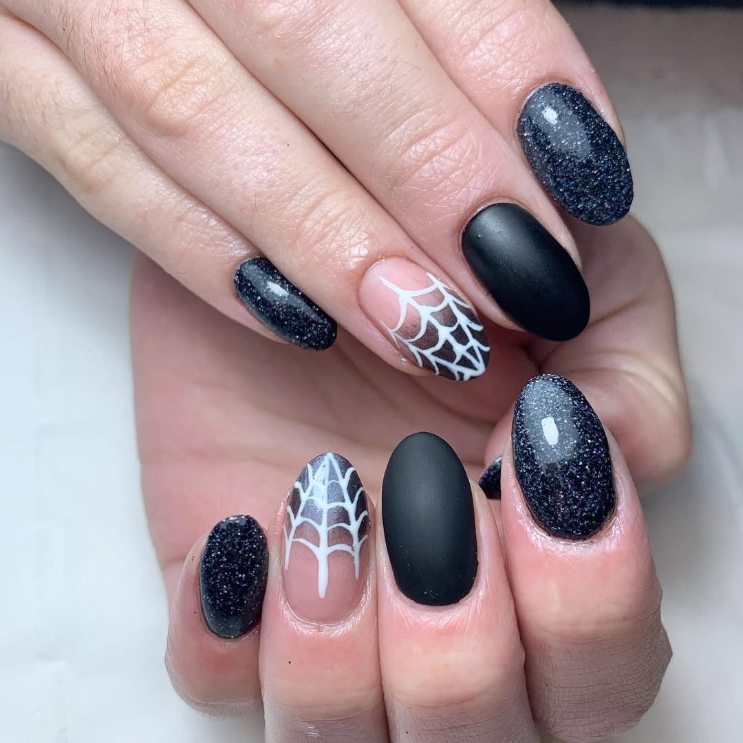 Halloween? Maybe. Haute couture? Absolutely. Black galaxy glitter wraps some nails like a night sky, while crisp white spiderwebs sprawl across nude bases—more art installation than costume party.