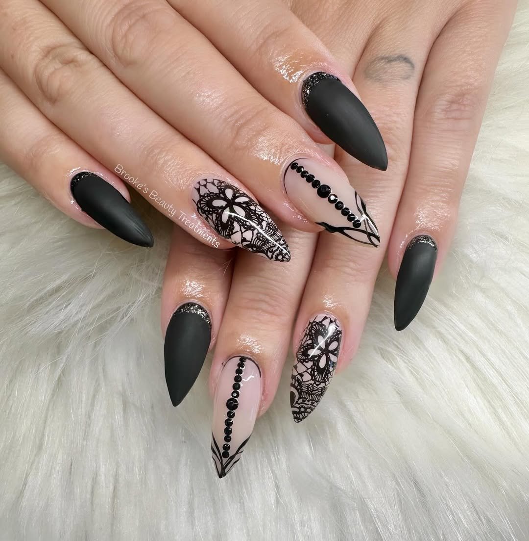 Think black lace evening gown, but make it nails. Matte black tips melt into transparent sections adorned with intricate lace patterns, while a jeweled spine of glossy beads runs dramatically down the center of one nail. The result is gothic glamour with couture precision.