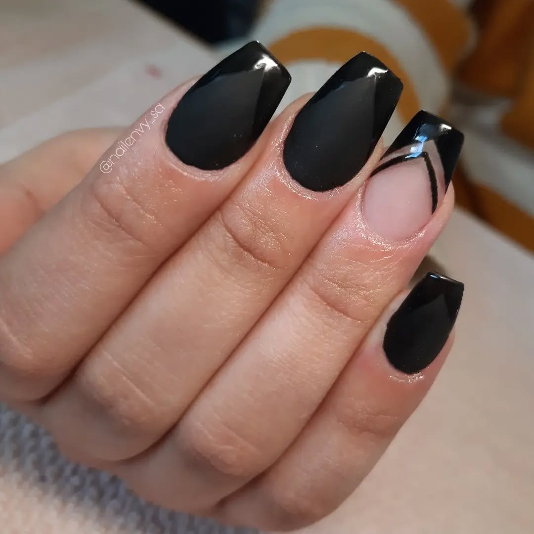 These nails redefine what “French tips” can be—sharp angles, matte black panels, and precise glossy striping that cuts through negative space. It’s modern architecture translated into nail form, with every line perfectly intentional.