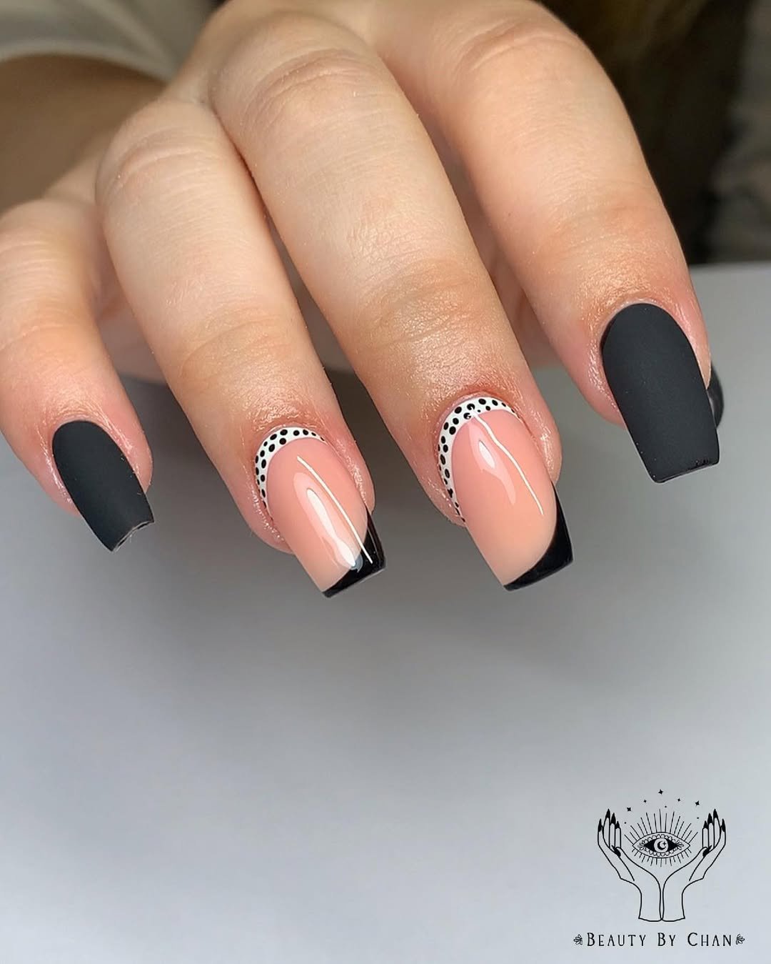 A masterclass in balance, this set blends nude polish with inky matte black, layering in French tips, micro-dots, and sleek, elongated lines. It’s minimalism meeting high-fashion detail, each nail a different story within the same aesthetic novel.