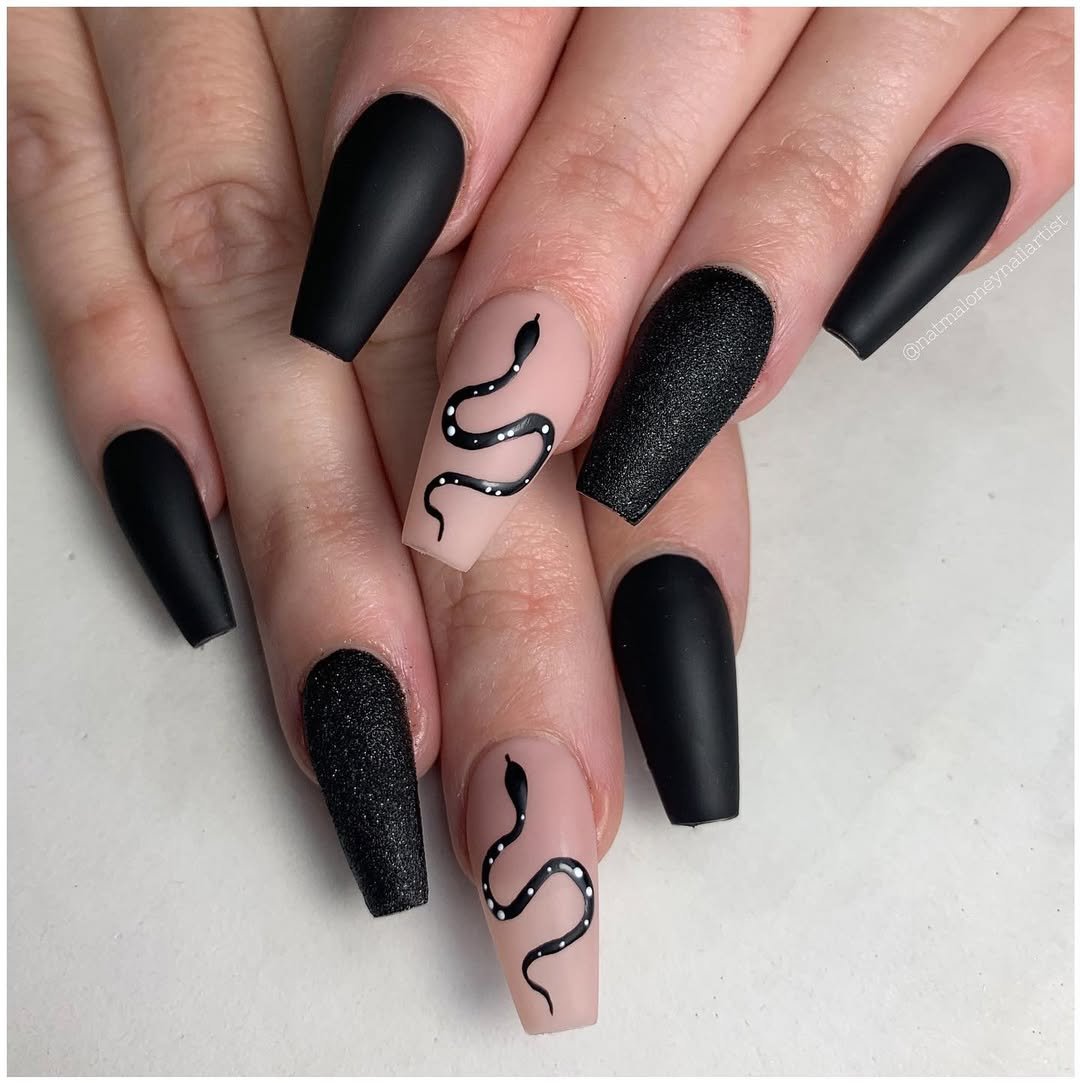 Two nude nails become the stage for an inky black snake, coiled and ready to strike, dotted with pearls that glint like moonlight on scales. The surrounding coffin nails shift between matte black and gritty sugar texture, adding a double hit of danger and decadence.