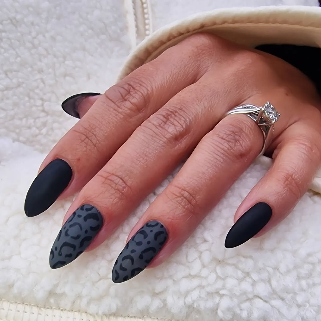 Matte black nails stalk under the radar until light hits—then the glossy leopard print leaps out, subtle yet feral. It’s like wearing a designer gown that only reveals its intricate embroidery when you’re standing inches away.