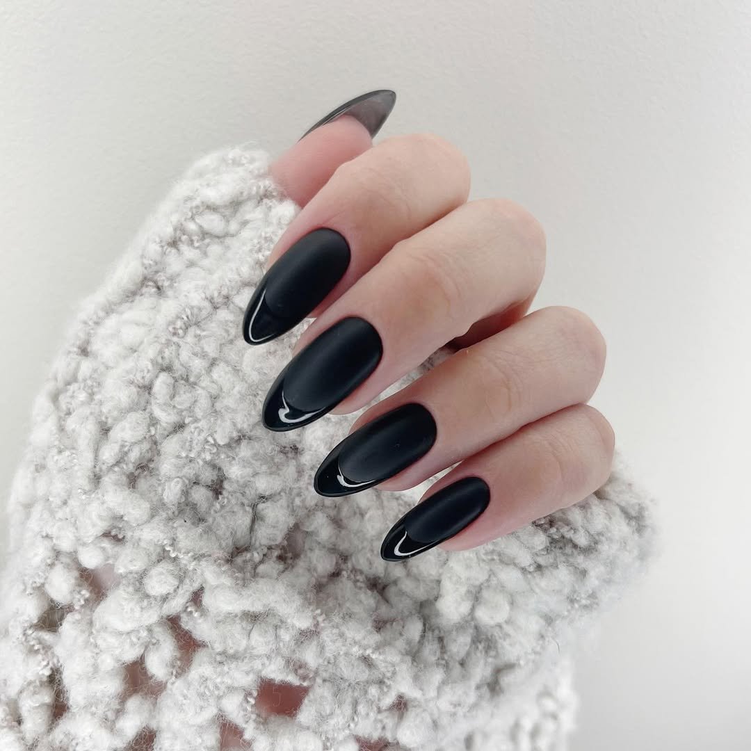 An intoxicating mix of matte and gloss makes these almond-shaped black nails impossible to ignore. The velvety base pulls you in, while the glossy, razor-sharp tips give just enough flash to feel dangerously chic. It’s like couture eveningwear, distilled into manicure form.