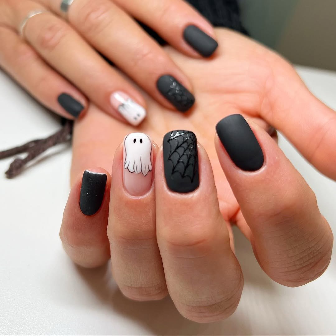 A matte black canvas sets the stage for playful Halloween storytelling—ghostly silhouettes, delicate spiderwebs, and the occasional nude peek-through for balance. It’s festive without being overdone, charming without losing its edge.