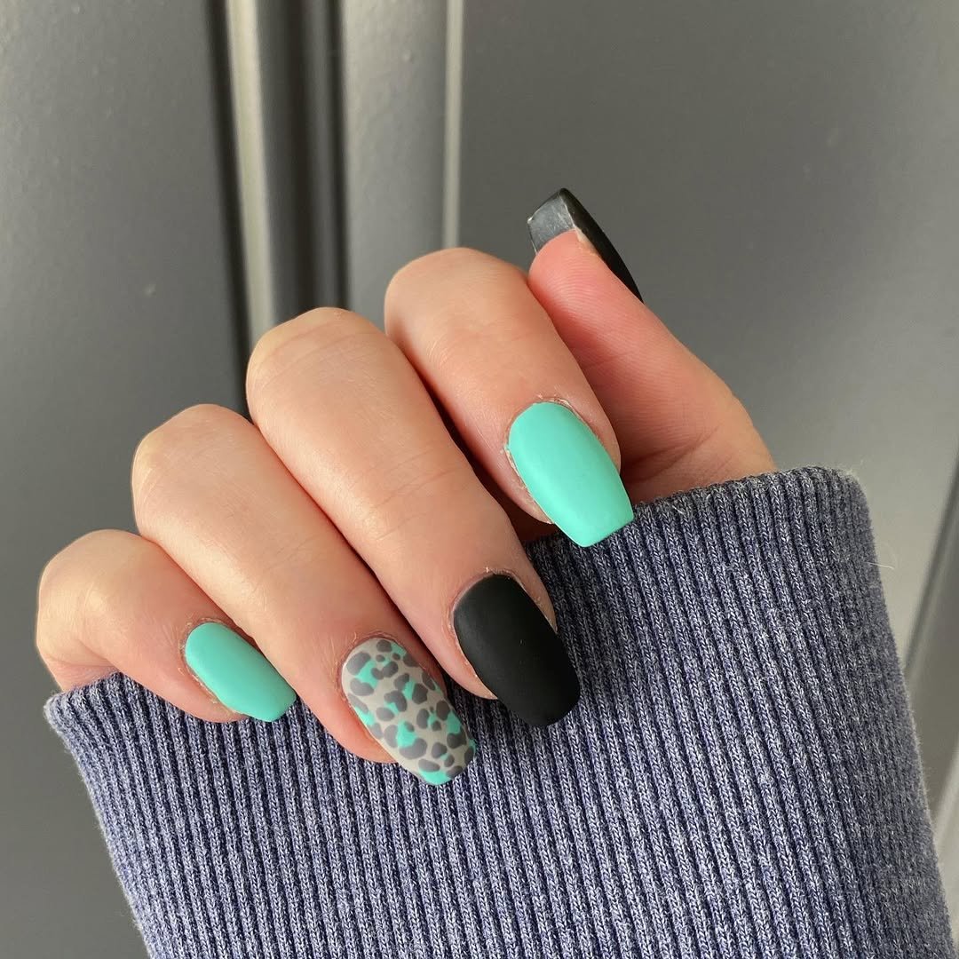 This set is summer in the city—matte black for the rooftop nights, turquoise for the rooftop pools, and a single leopard-print accent to remind everyone you’re untamable. The contrast is electric, like neon signs glowing against wet pavement.