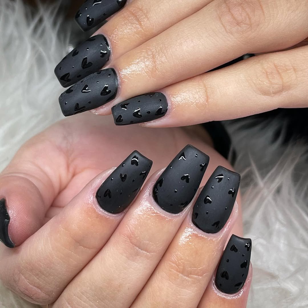 A love letter in black-on-black, these squared matte nails are scattered with tiny glossy hearts that only reveal themselves when the light hits just right. It’s playful, intimate, and dripping with flirtation.