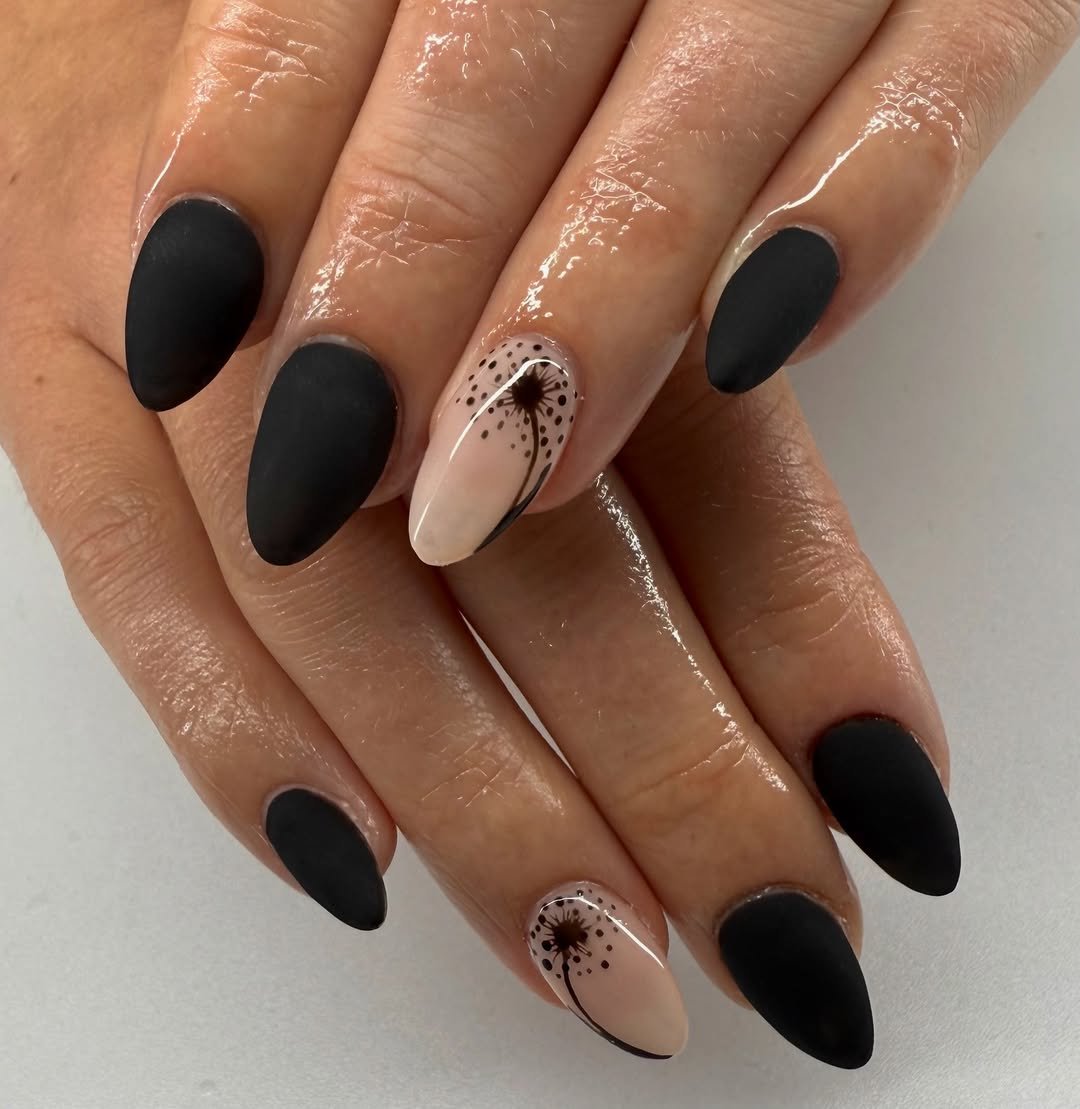 These almond-shaped beauties are mostly inky matte black, but two nails hold a delicate surprise: soft nude painted with the fragile outline of a dandelion caught mid-flight. The wispy seeds seem frozen in time, ready to drift away with a sigh.