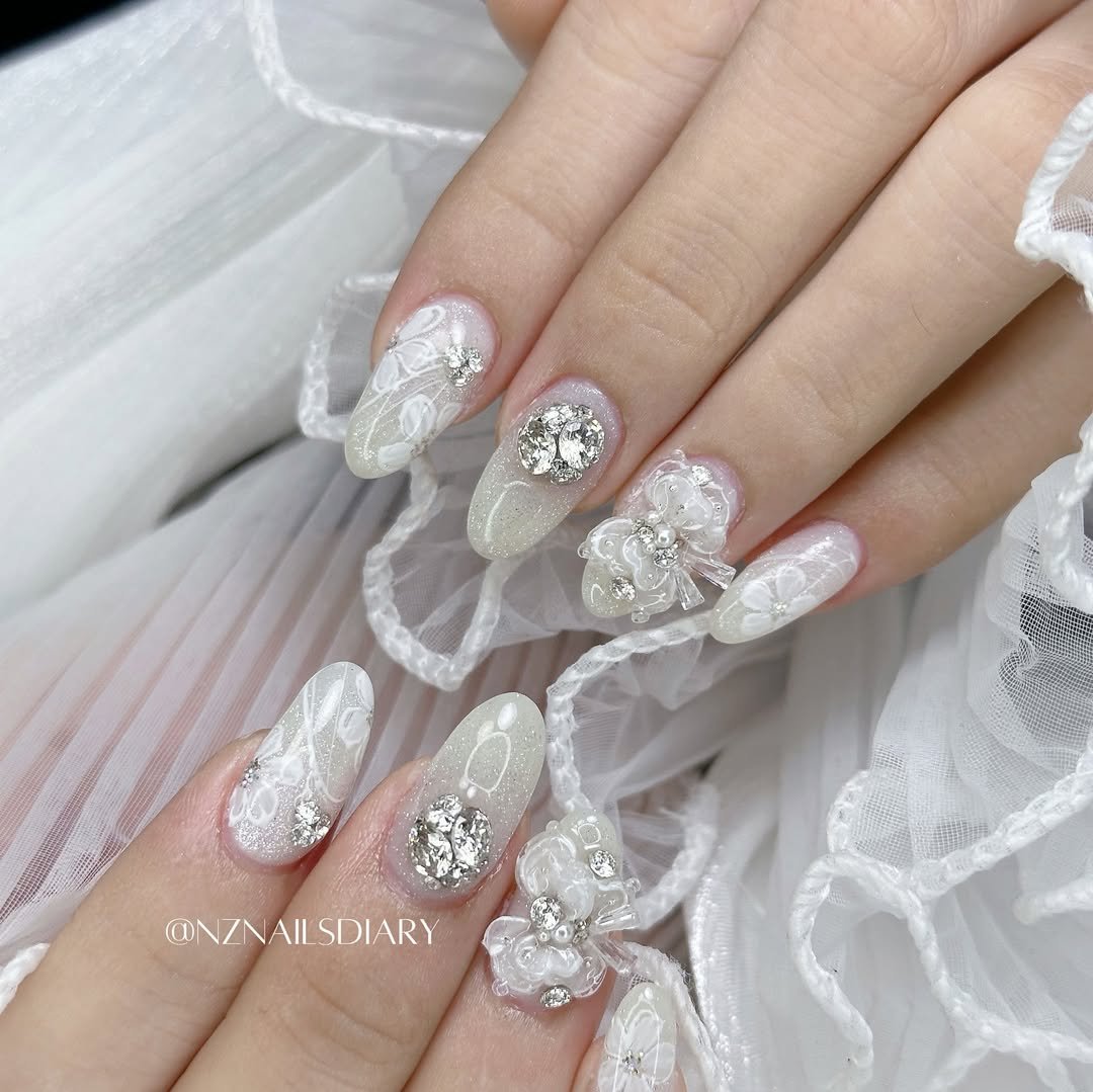 Lace. Rhinestones. 3D sculpted florals. These nails are not just bridal—they’re bridal on the runway of Versailles. Every finger is a baroque fantasy, with crystal clusters so bold they practically sparkle with their own soundtrack. And that sheer milky base? Angelic.