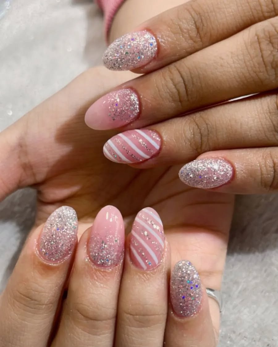 These nails are giving champagne sparkle, candy stripe couture, and a full-on glitter meltdown—in the best way. Each fingertip is a different party: some drenched in silver stardust, others layered in rosy shimmer or iced with peppermint-pink lines.