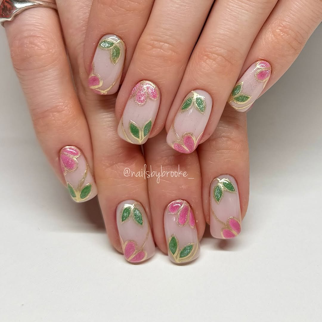 This set looks like it was lifted straight from a stained-glass cathedral window in Versailles. Each fingertip is traced with glistening pink tulip petals and emerald green leaves, all edged in molten gold so fine it could’ve been painted with a whisper. It’s delicate, yes—but with a decadence that practically hums.