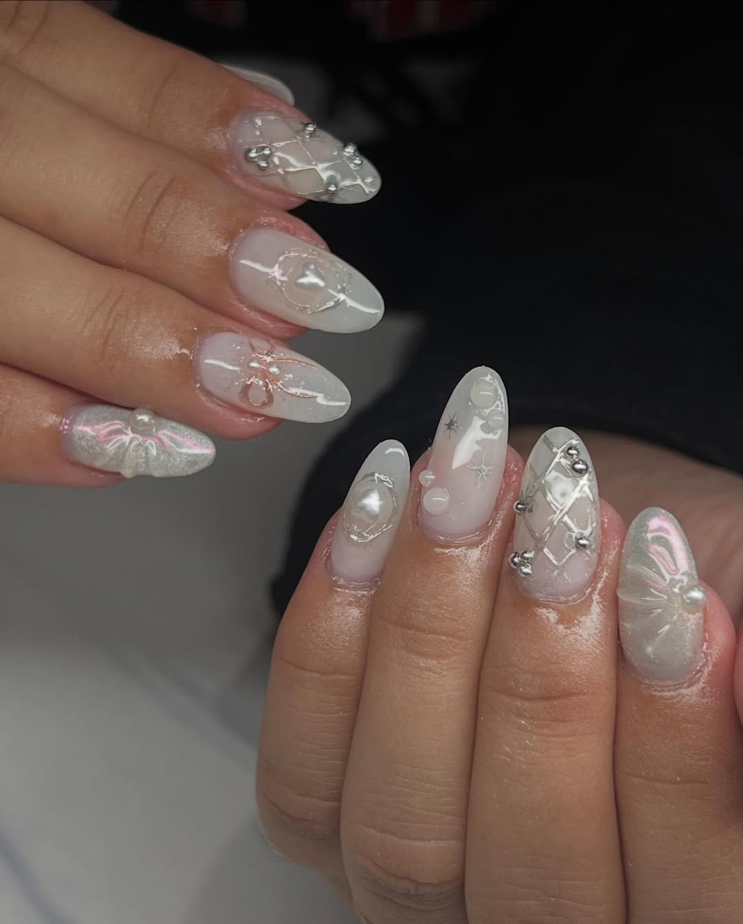 It’s bridal, but make it from another planet. Pearlescent bows, holographic grids, chrome butterflies, floating hearts—every nail is an alien love letter to your inner glam queen. The icy-white base glows like moonlight, while silver embellishments scatter across like constellations on a bridal galaxy.