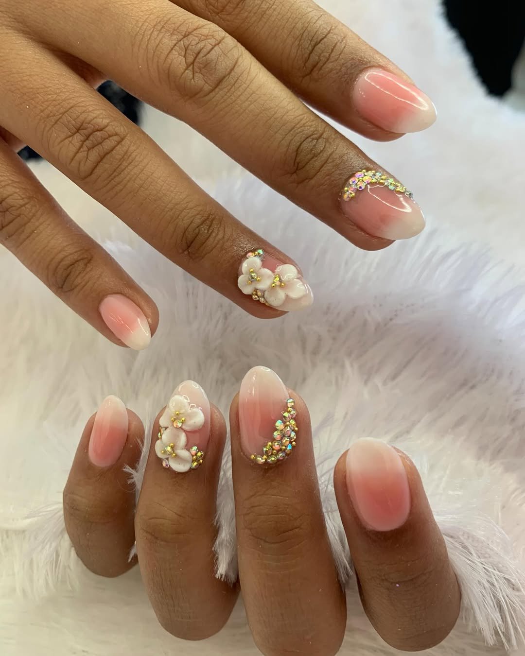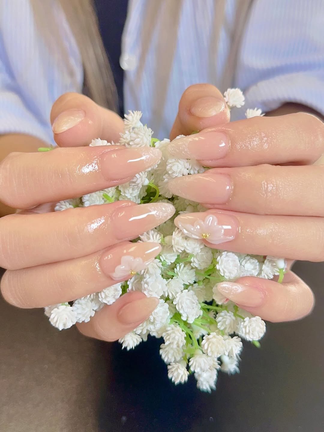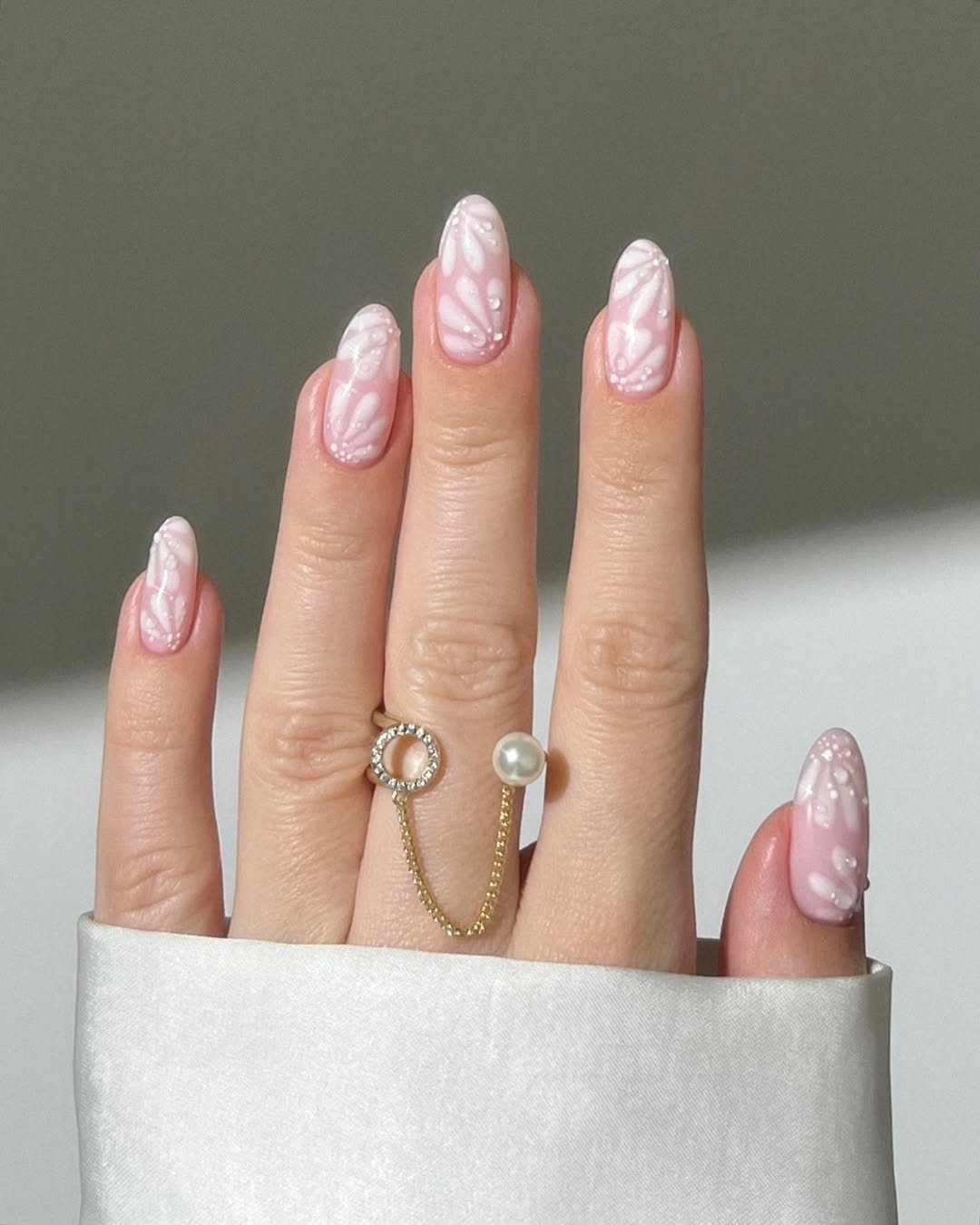 This manicure doesn’t just look like a dream—it feels like one. Glossy ballet pink is layered with floating white petals so airy they could’ve been plucked from a cherub’s wings. And don’t even get us started on those tiny pearls, dotting the surface like sacred raindrops.