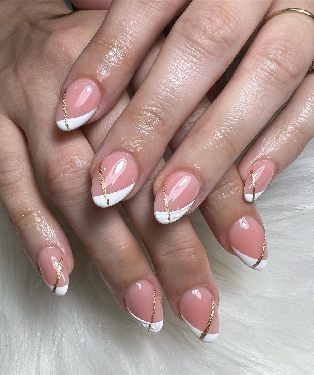 What do you get when you take classic French and dress her in couture? This. Bold white tips sliced with glimmering gold ribbons, anchored on blush-pink bases so clean they look dipped in jelly gloss. A few dainty pearls remind you this is still bridal—but elevated.