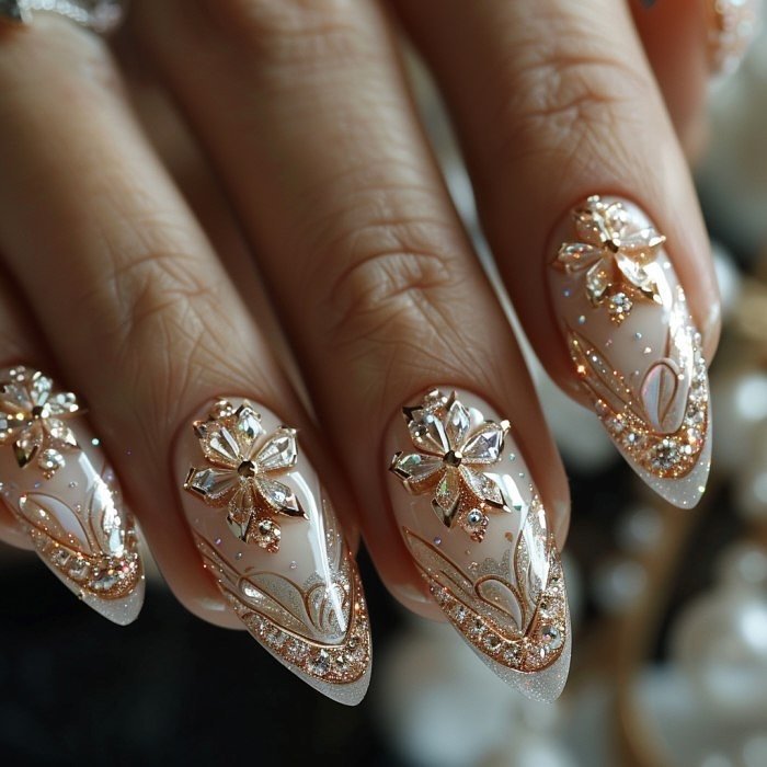These nails don’t walk down the aisle—they strut. Imagine florals sculpted in 3D metallic gold, layered over milky gel and exploding in crystalline brilliance. There’s drama, dimension, and detail so rich, you’d think each finger came with its own security guard.