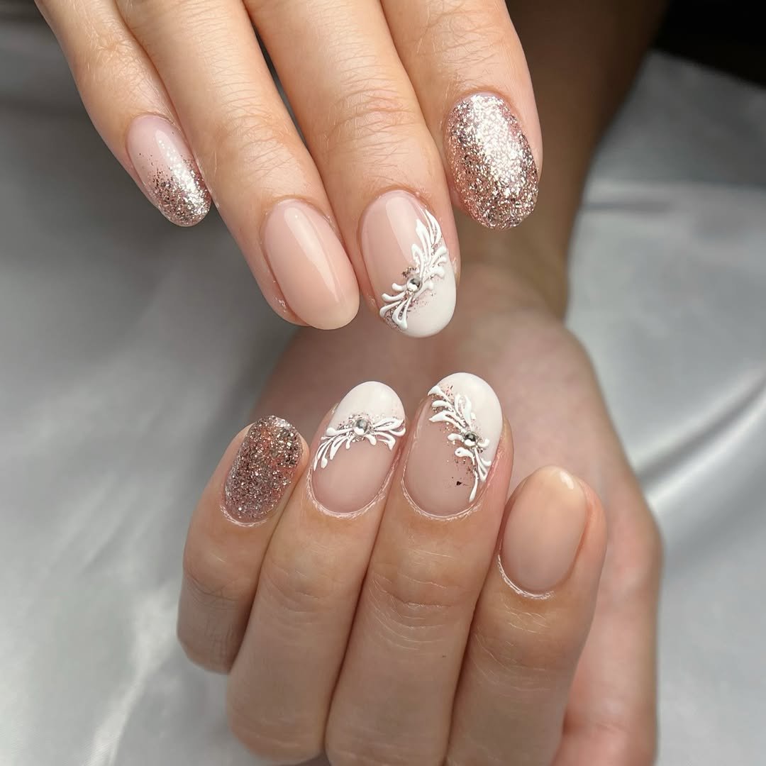 This set is bridal grandeur dialed up to eleven. Nude blush bases melt into sparkling rose gold, while sculpted white laurels curl like royal insignia across the nail bed. One glance and it’s clear—this isn’t soft glam. This is bridal opulence served on a platinum platter.