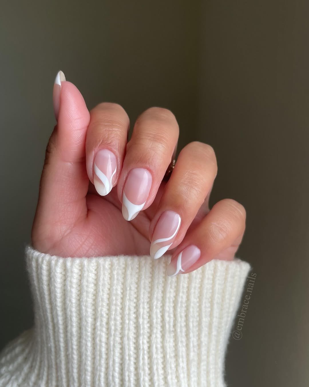 The French tip just had a full-blown glow-up. Sleek white ribbons curl across a sheer pink base in a swirl so hypnotic it deserves its own soundtrack. These nails are all curve, no cliché.