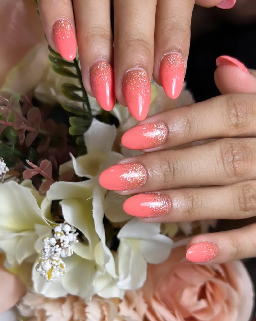 This set is pure celebration bottled into a manicure. A juicy coral-pink gradient meets shimmering champagne glitter in a look that’s equal parts playful and radiant. It’s giving “popping the first bottle of bubbly” energy… before the ceremony even starts.