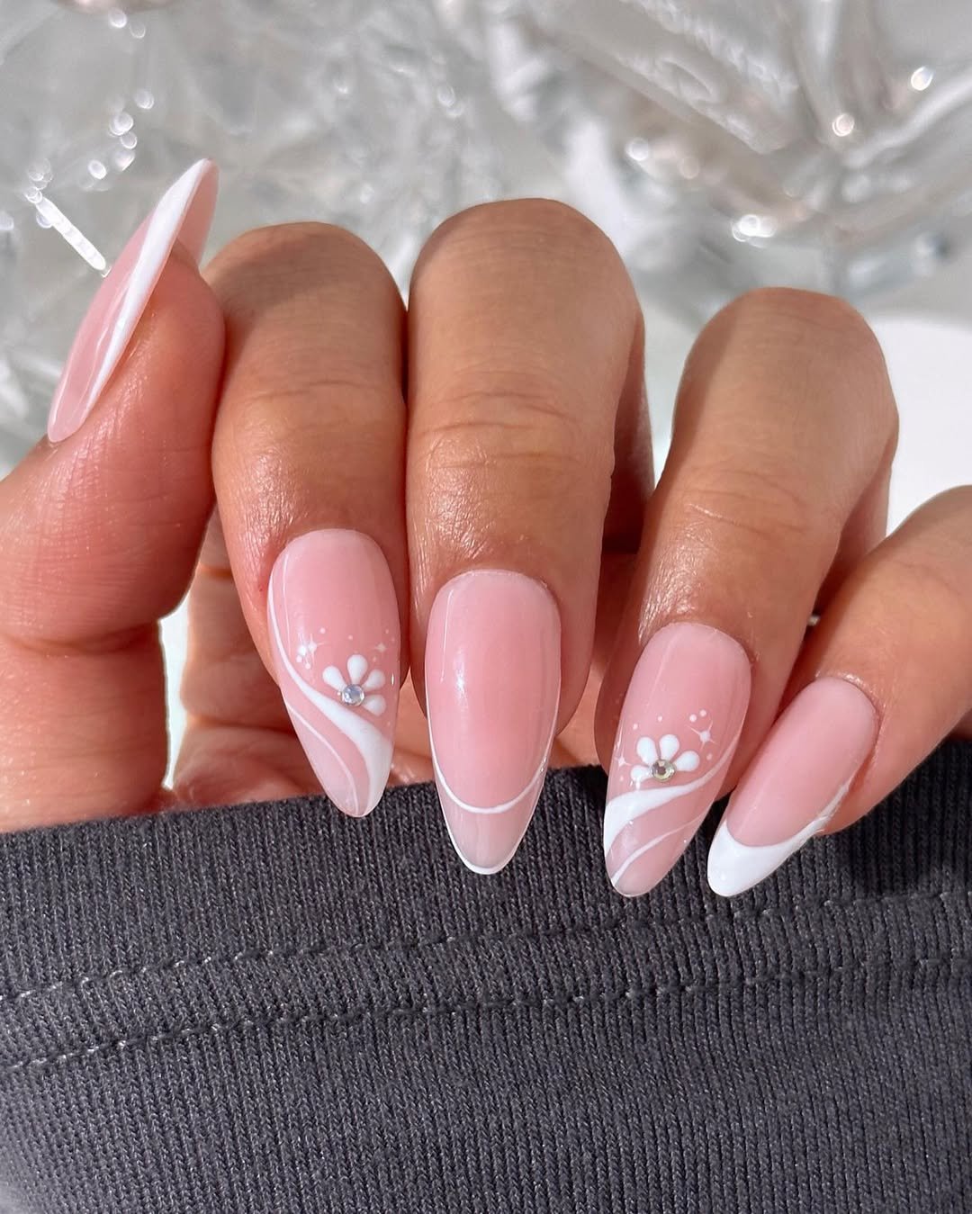 You can almost hear the harp strings. These nails are soft-spoken magic, where subtle French waves meet tiny floral blooms that look like they drifted from a bridal crown. A single rhinestone on each flower gives the entire set its glow-from-within finish.